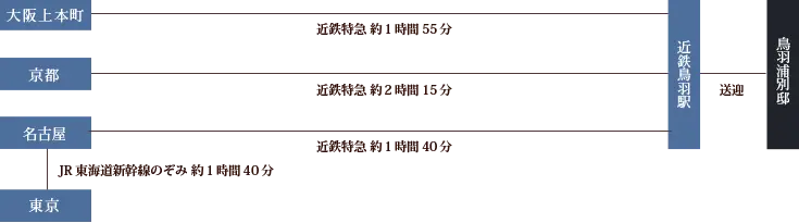 ■東京-豊田JCT-四日市JCT-亀山JCT-伊勢I.C-[伊勢二見ライン]-鳥羽(下りる)-一般道-当館